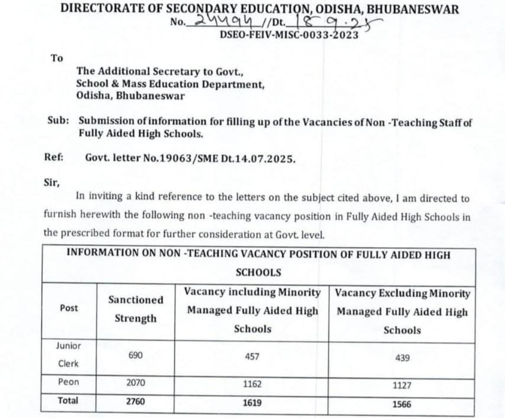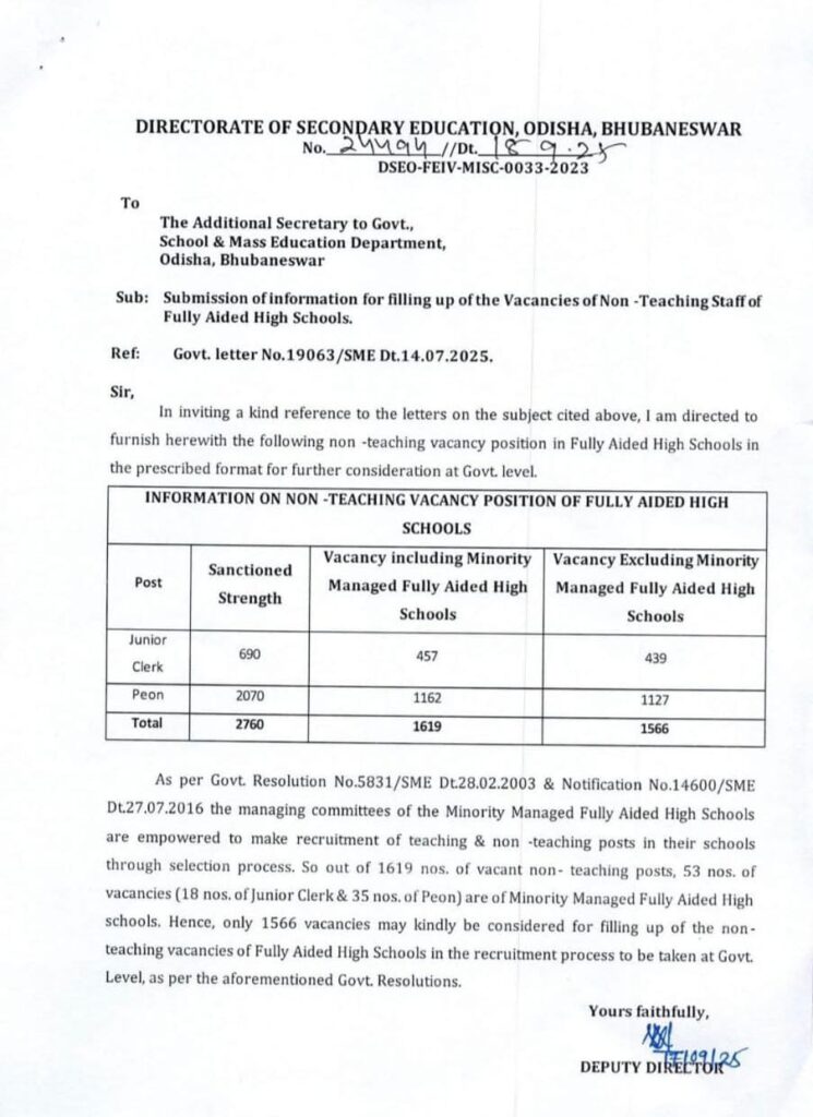 Vacancy in Odisha Govt Job 2025: The Directorate of Secondary Education, Odisha has released important information regarding 1566 non-teaching vacancies in Fully Aided High Schools across the state. According to the latest official communication, there are massive vacancies for Junior Clerk and Peon positions that are likely to be filled soon through a government recruitment process.
